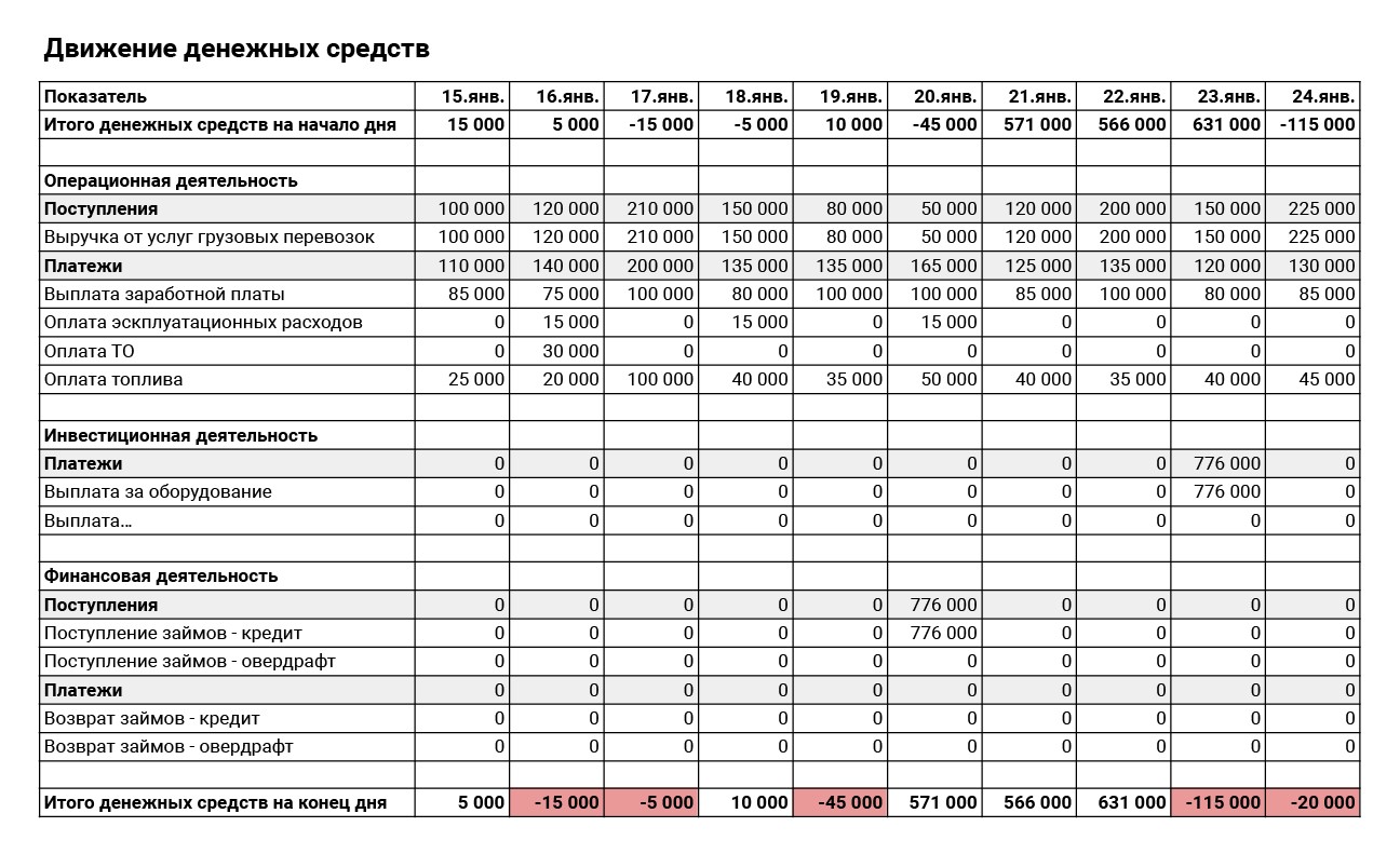 Пример таблицы движения денежных средств: красным в нижней части таблицы показаны кассовые разрывы