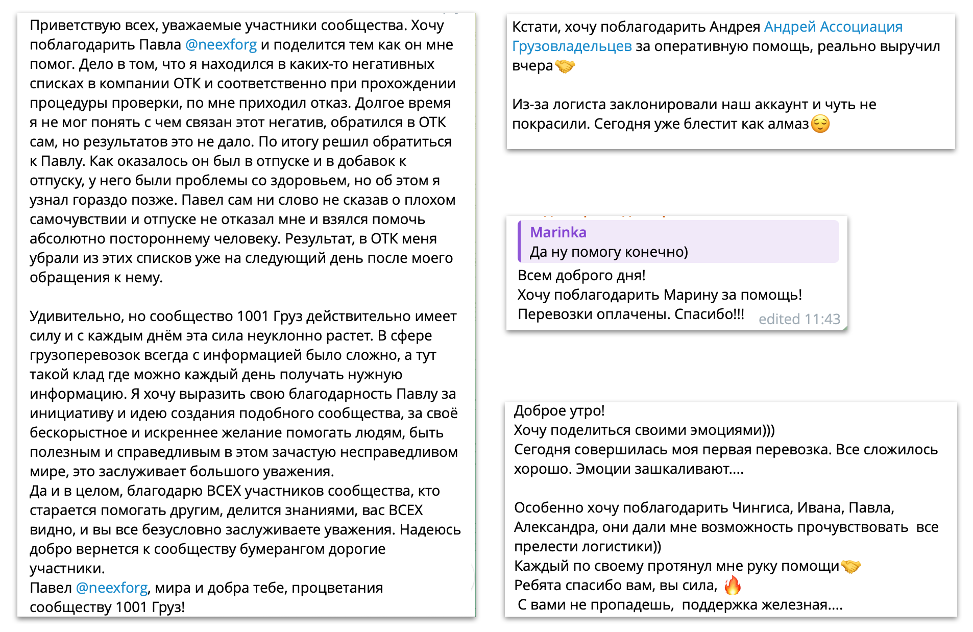 Создавая «1001 груз», я не ожидал, что это сообщество станет таким мощным и живым. Сегодня я горжусь тем, что помог многим людям и вижу, как вместе мы меняем рынок грузоперевозок изнутри — делая его более справедливым, прозрачным и человечным. Сообщество «1001 груз» — пример того, что в этой отрасли возможны живой диалог, помощь и защита. Для многих участников оно как «большой папа», который вовремя подставит плечо, защитит, не оставит один на один с бедой.