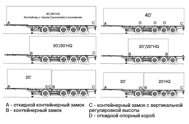 Контейнеровозы бывают двух-, трех- и четырехосные. Последние позволяют увеличить тоннаж перевозимого груза в сцепке со стандартным тягачом: согласно действующим нормам, масса шестиосного автопоезда составляет 44 тонны, тогда как у пятиосного — 40 тонн.