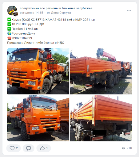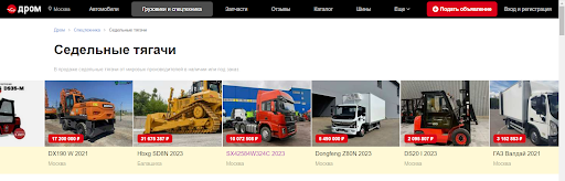 В объявлениях на Авито, Дроме и Авто.ру лучше давать подробные описания техники с большим количеством фотографий. Аудитория площадок целенаправленно ищет технику в каталоге, подбирает по фильтрам, поэтому заинтересована в исчерпывающей информации и готова ее изучать. Например, пользователь может выстроить поиск авто по году выпуска, пробегу, типу коробки передач или кабины.