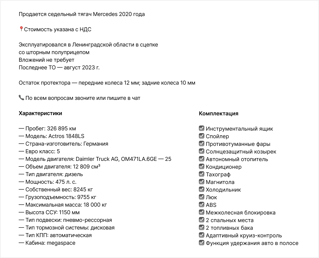 Сведения о транспортном средстве дадут ответы на многие вопросы потенциального покупателя. Поэтому важно указать максимально полную информацию: данные ПТС, технические характеристики, габариты тягача и полуприцепа, дату последнего техобслуживания, комплектацию, состояние шин.