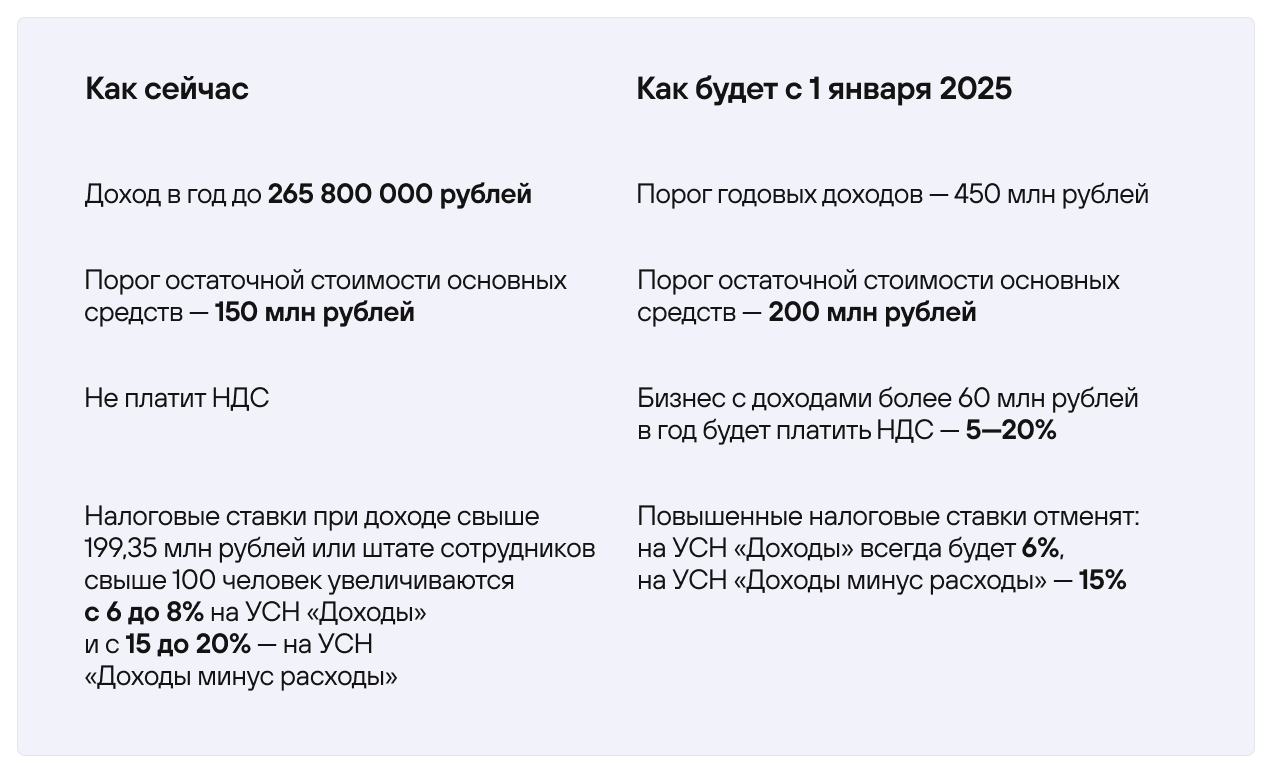 Пока бизнес на УСН платит один единый налог: сейчас он составляет от 6 до 20%. Для сравнения: все организации и предприниматели на общей системе налогообложения (ОСНО) платят 20% налога на добавленную стоимость + 20% налога на прибыль юридических лиц, если компания зарегистрирована как ООО, или 13% подоходного налога, если оформлен статус ИП.