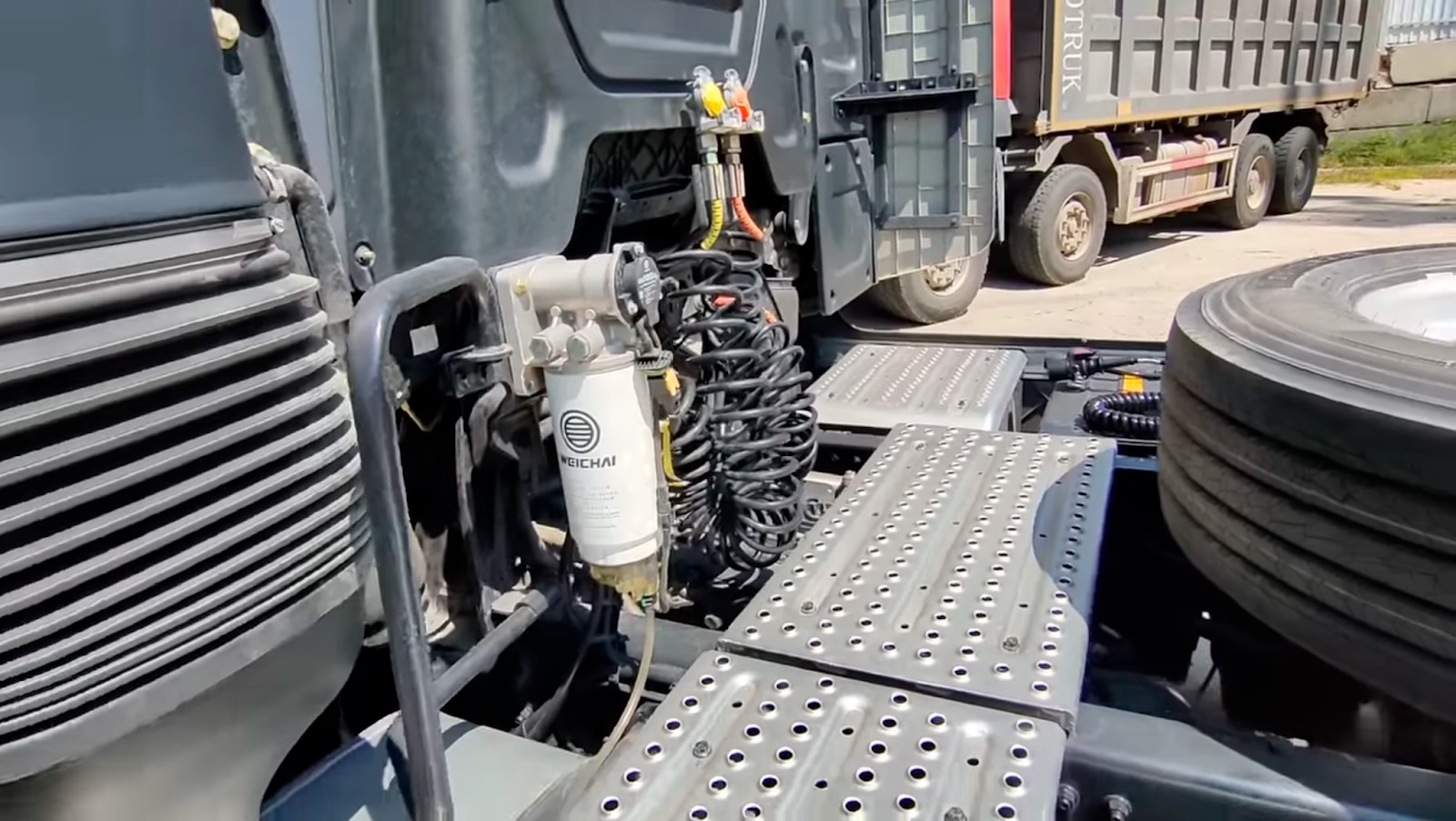Улучшенная безопасность — перенесли топливный фильтр-сепаратор с насосом подкачки за кабину, а бачок ГУР — за защитный щиток. Раньше они стояли в нише переднего левого колеса и был риск серьезных повреждений при взрыве баллона.
