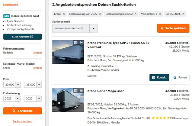 Подобрать подходящий тягач или полуприцеп можно на немецком сайте mobile.de — это основной ресурс для поиска транспортных средств. В других европейских странах тоже есть аналогичные порталы. Например, в Польше это OTOMOTO.