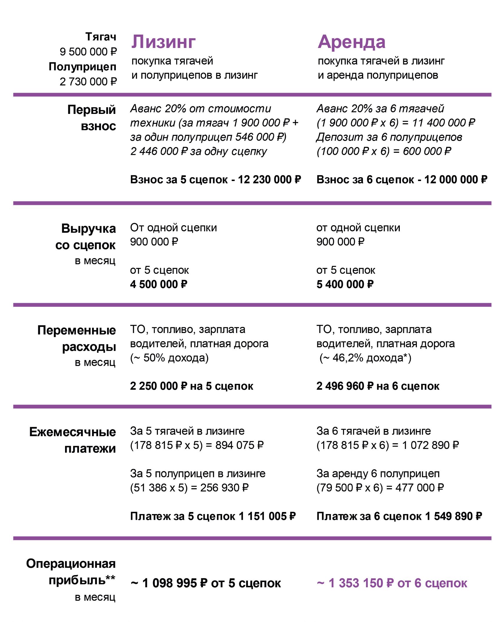* Арендодатель сам несет расходы по обслуживанию, ремонту, страхованию и замене износившихся шин на арендованном полуприцепе ** Операционная прибыль — выручка после вычета переменных расходов и платежей по лизингу