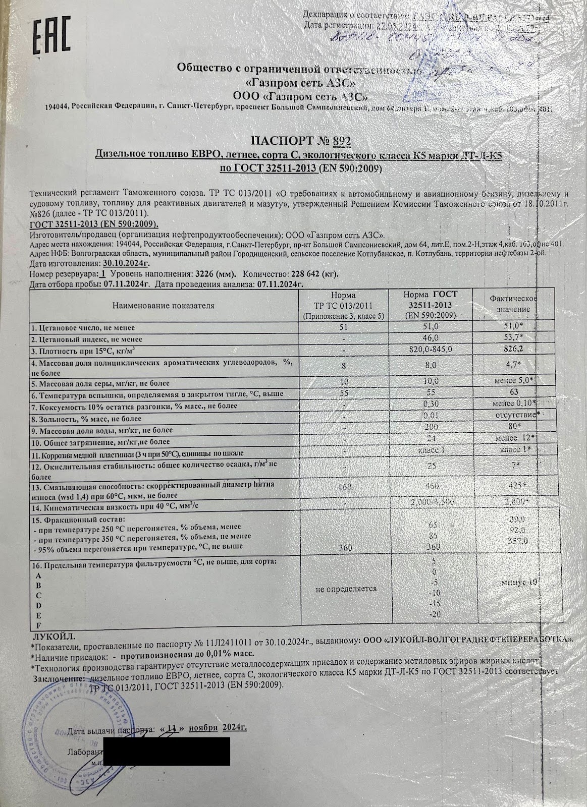 Если на колонке нет маркировки топлива, можно перед заправкой попросить паспорт качества. Его обязаны предоставить потребителю на любой АЗС. В документе будет указана предельная температура фильтруемости и массовая доля серы того топлива, которое сейчас на заправке.
