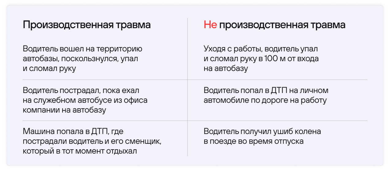 Водитель может пострадать в ДТП, при погрузке и выгрузке товара, во время замены колеса или ремонта техники. Несчастным случаем на производстве признают любую травму, если водитель получил ее, выполняя рабочие обязанности. В том числе в период отдыха между сменами, а также во время поездки на самолете или поезде — при вахтовой работе.