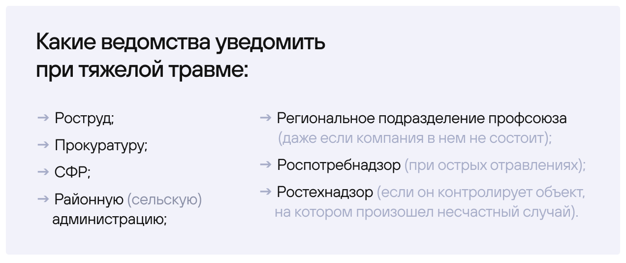 Уведомьте государственные органы по месту происшествия. О легком несчастном случае следует сообщить только в СФР (Социальный фонд России), а о тяжелом нужно проинформировать несколько ведомств.