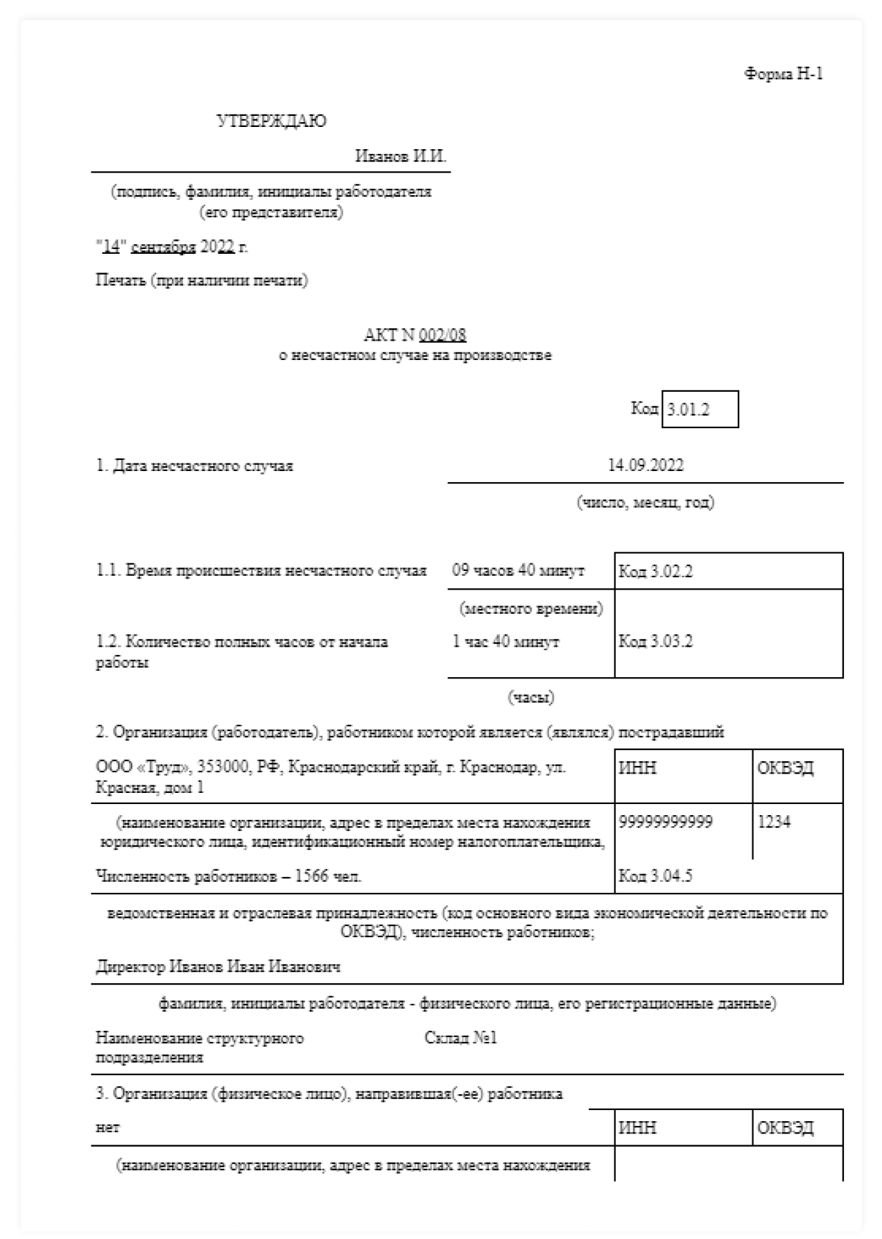 При тяжелой или групповой травме оформляется акт о несчастном случае на производстве по форме Н-1 на каждого пострадавшего в трех экземплярах.