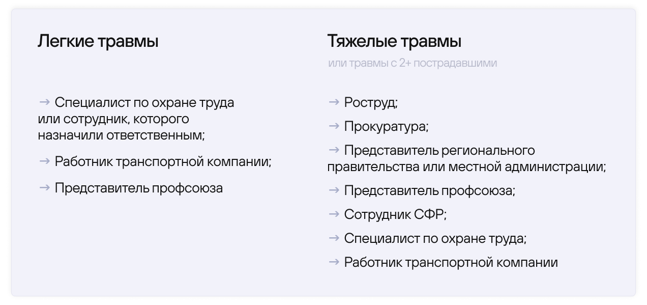 При легкой травме председателем комиссии обычно назначают руководителя транспортной компании. А в тяжелых случаях — инспектора Роструда. Но если травма произошла на объекте, подконтрольном Ростехнадзору, возглавлять комиссию будет сотрудник из этого ведомства.