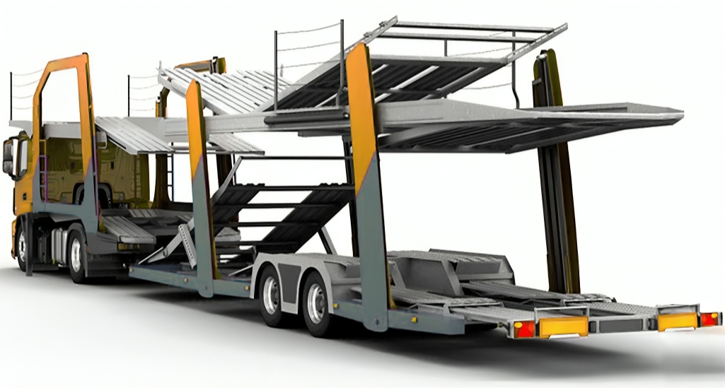 13. Автовоз. Полуприцеп для перевозки автомобилей и других транспортных средств с одним или несколькими ярусами (палубами), расположенными горизонтально или под наклоном. Оборудован специальными механизмами для погрузки и разгрузки техники, например, лебедкой, манипулятором, сходнями или телескопическими гидроцилиндрами для подъема на второй уровень.
